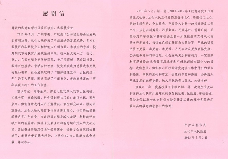 近日,中共從化市委、從化市人民政府再次致信星河灣集團(tuán),對(duì)集團(tuán)兩年多以來(lái),在對(duì)口幫扶從化市的各扶貧項(xiàng)目中所表現(xiàn)出來(lái)的高度社會(huì)責(zé)任感與大愛(ài)精神表示最崇高的敬意和最衷心的感謝,并值從化市一年一度荔枝佳節(jié)來(lái)臨之際,送來(lái)嶺南佳果以品嘗。