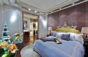 主臥大量運用有“水芙蓉”之稱的荷花為題材,襯托出來靈動的空間。主要色調為象牙白及棕色系,充滿中式情懷。中式元素的細節處處體現,包括墻紙的中式花紋、衣帽間門精致的手工雕刻中式花紋。