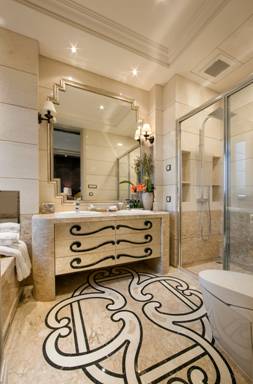 洗手間采用雙洗手盆的設計,洗手間儲物柜上運用的了“六如意”的中式圖案及水墨畫紋理的大理石,地面花紋為牡丹花,藝術感強。