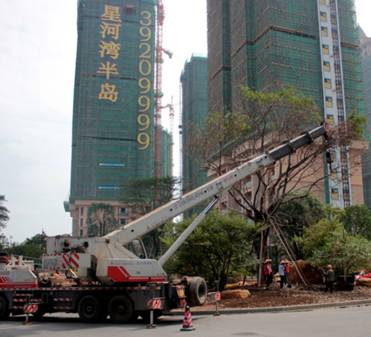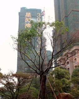 在前文提到的菩提榕,樹形高大豐滿,為了全冠移植這棵菩提榕,最大程度的在業主面前呈現她的美感,星河灣不惜拆掉一個收費崗亭,并且在午夜時分,由警車開道,才將這棵大樹從苗圃運送到星河灣半島。