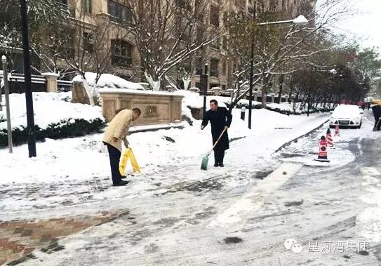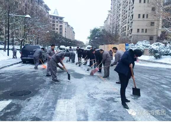 這是大雪來臨的早晨,7點剛過,北京星河灣物業公司的全體成員已經整裝到崗,集中清理星河中路及兩側道路的冰、雪,保障小區業主的安全出行。
