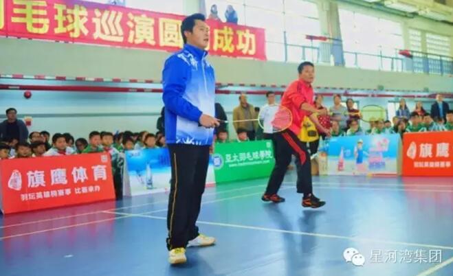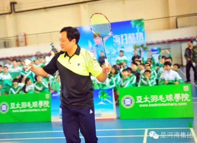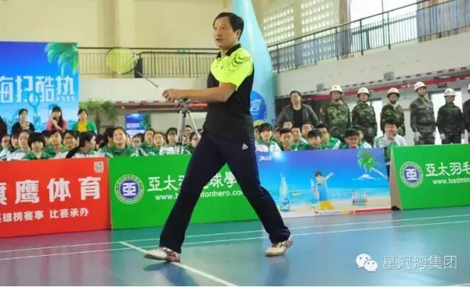 3月18日上午10點,由亞太羽毛球學院舉辦的2016年廣東名校羽毛球巡演活動上,楊陽及由退役專業球員擔任的亞太羽毛球學院的教練聯手,給星河灣廣州市番禺執信中學的師生們帶來了精彩的球技表演。