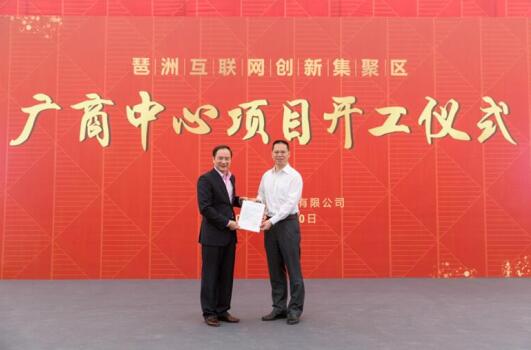 ▲海珠區委副書記 區長李海洲(右)頒發項目開工許可證